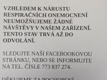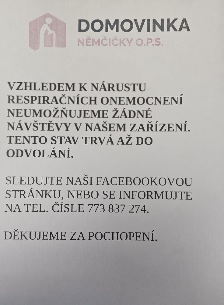 Z důvodu výskytu respiračního onemocnení nebudou do odvolání možné návštěvy v našem zařízení. Děkujeme za pochopení.
